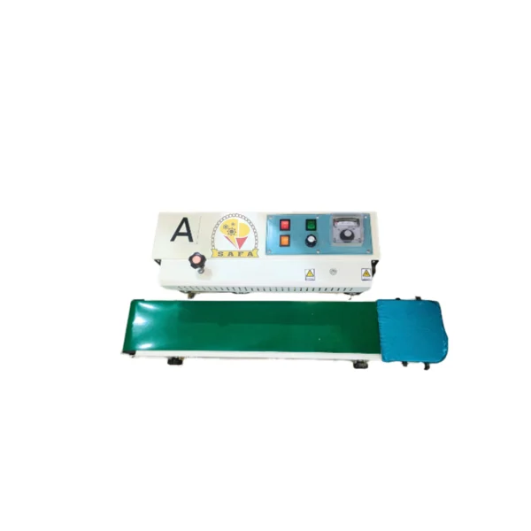 تعمل الماكينة بنظام تسخين مستمر مع سير ناقل يتحرك بثبات لضمان إغلاق محكم ومتجانس لكل كيس، ما يحافظ على جودة المنتج ومظهره النهائي.