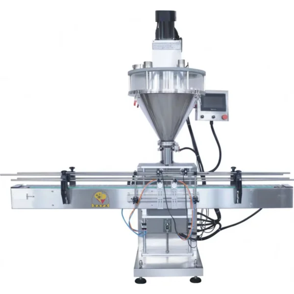 هذه ماكينة تعبئة بودر / مسحوق / حبيبات خفيفة تعتمد على نظام “أوجر” (Auger / برمي Screw) لتوزيع وقياس كمية من المسحوق ثم تعبئتها داخل عبوة أو كيس أو زجاجة/برطمان.