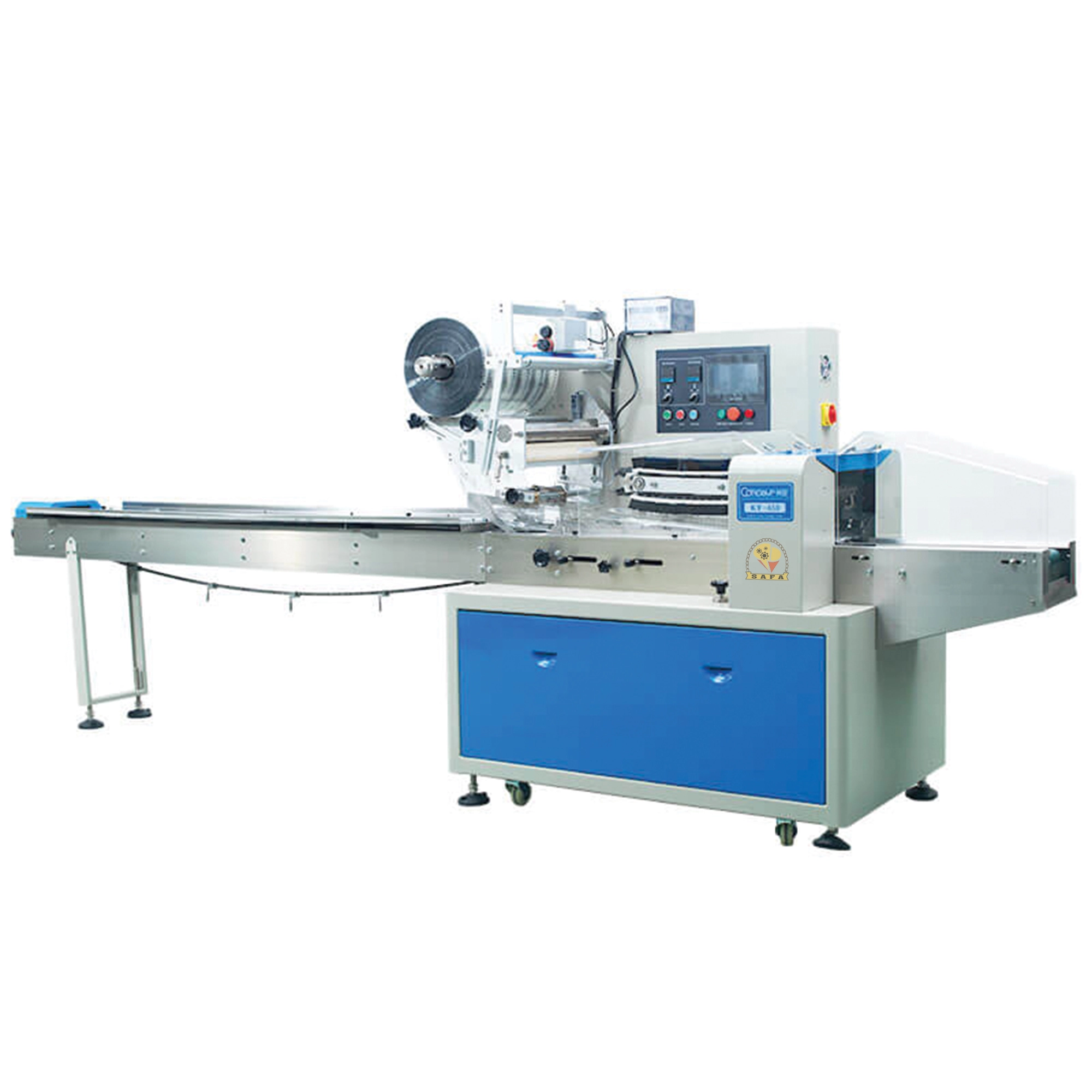 ماكينة تغليف أوتوماتيكية بنظام Flow Pack تتميز بالدقة العالية والسرعة في تغليف المنتجات باستخدام أفلام لحام حراري. تعتمد على محركات سيرفو وشاشة لمس للتحكم السهل، وتوفر لحام محكم ومظهر احترافي للعبوات، مما يجعلها مناسبة لتغليف المنتجات الغذائية والصناعية بكفاءة عالية.