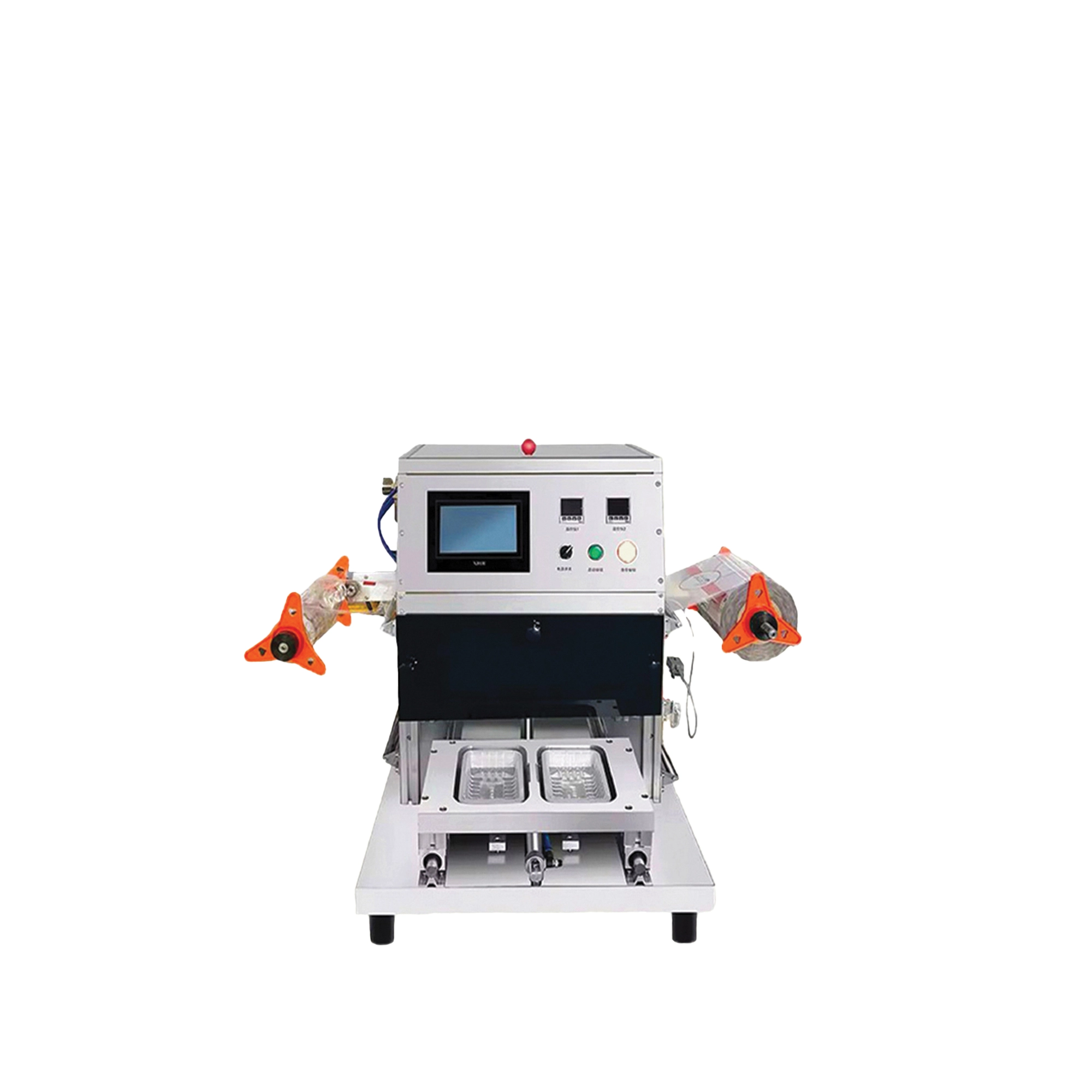 آلية التشغيل: يتم وضع الحاوية (الطبق/الصندوق الكبير) على المسار الأول أو الثاني (من “2-Tray”). بعد ذلك، يتحرك الغطاء أو فيلم التغليف إلى موقع الختم بواسطة ناقل أو يد ميكانيكية.
