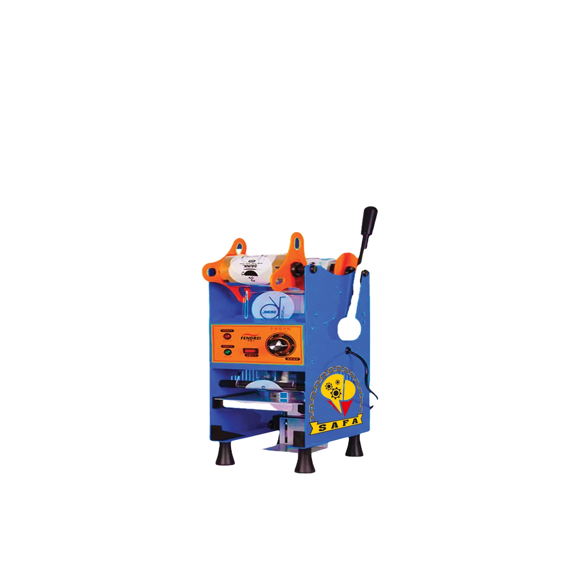 الماكينة المُشار إليها هي ماكينة غلق أكواب مانوال : تُستخدم لتغليف سطح الكوب التغريزي بغشاء بلاستيكي أو فيلم بلاستيكي، بحيث يُغلق الكوب بشكل محكم تمنع به التسريب أو التأثير على جودة المحتوى (شراب، عصير، شاي، أيس كريم، عصائر فواكه، وغيرها).