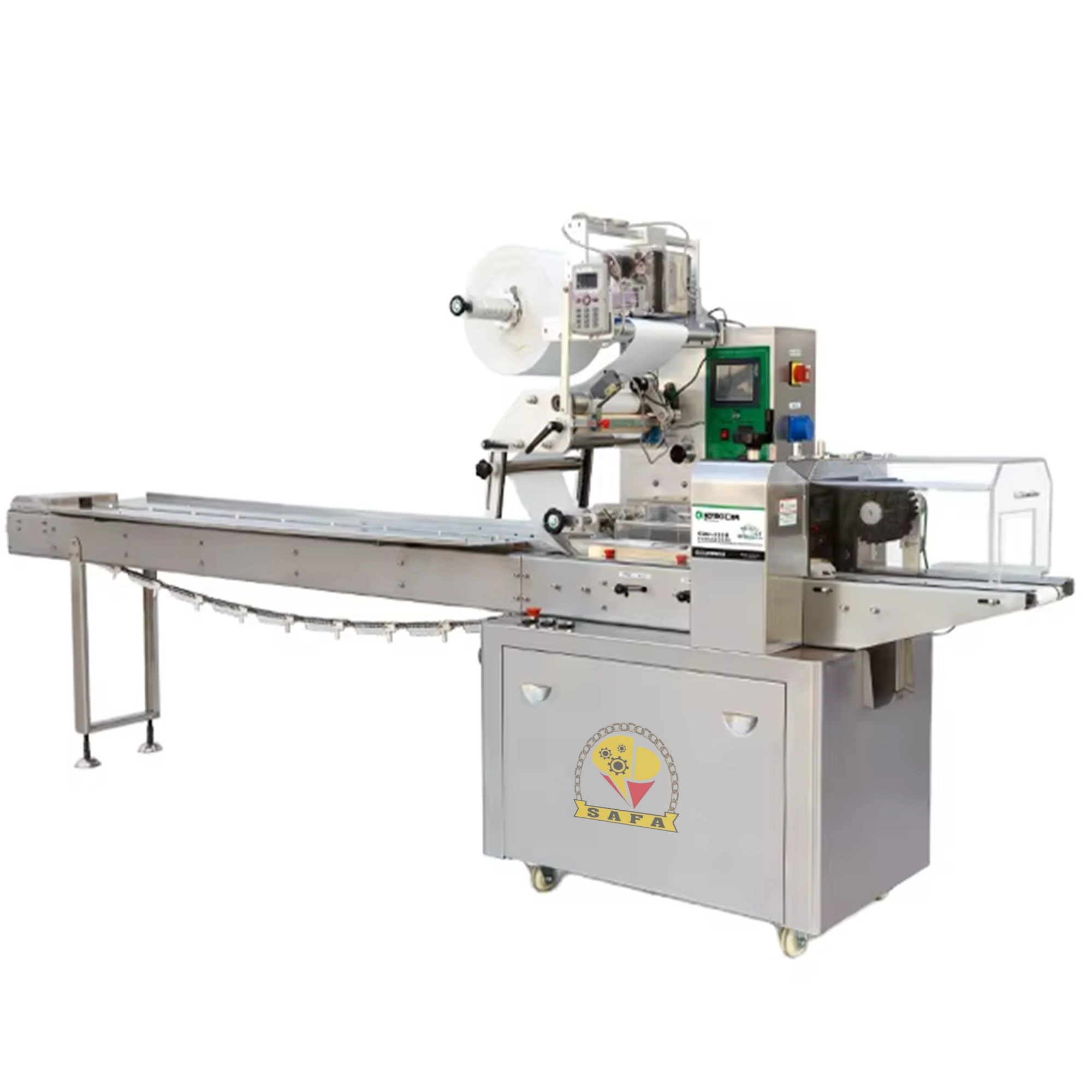 ماكينة التغليف الأفقية (Flow Pack) هي ماكينة أوتوماتيكية تستخدم لتغليف المنتجات داخل أكياس “وسادة” من فيلم بلاستيكي بإحكام، وتتميز بسرعة عالية، وسهولة في التحكم، ونظام لحام حراري دقيق يجعلها مناسبة لتغليف المخبوزات والسناكس والبسكويت والمنتجات الصغيرة المختلفة.